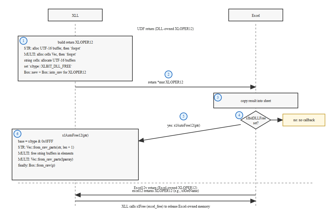 xlAutoFree12 is called by Excel after it has finished copying a value returned by one of your UDFs. This is the memory management callback. When a UDF returns a heap-allocated result (a string, a 2D array), it sets a flag (xlbitDLLFree) that tells Excel: “call me back when you are done so I can free this.” Without this function, every returned string and every returned array leaks.